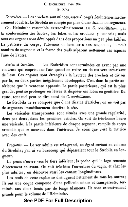 van Beneden, P.-J. 1850. Les helminthes cestoïdes, considérés sous le rapport de leurs métamorphoses, de leur composition anatomique et de leur classification, et mention de quelques espèces nouvelles de nos poissons plagiostomes. Bulletins de l’Académie Royale des Sciences, des Lettres et Beaux-Arts de Belgique 16(Part 2): 269-282. (470) Download PDFvan Beneden, P.-J. 1850. Recherches sur la faune littorale de Belgique. Les vers cestoides, considérés sous le rapport physiologique, embryogénique et zooclassique. Mémoires de l‘Academie Royale des Sciences, des Lettres et des Beaux-Arts de Belgique 25: 1-199 (+plates). (472) Download PDF |