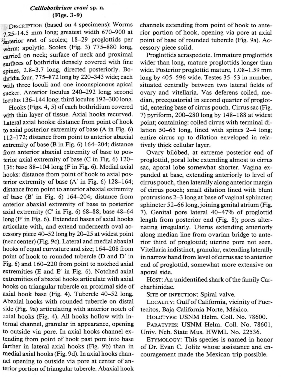 Caira, J. N. 1985. Calliobothrium evani sp. n. (Tetraphyllidea: Onchobothriidae) from the Gulf of California, with a redescription of the hooks of C. lintoni and a proposal for onchobothriid hook terminology. Proceedings of the Helminthological Society of Washington 52: 166-174. (89) Download PDFBernot, J. P., J. N. Caira, and M. Pickering. 2015. The dismantling of Calliobothrium (Cestoda: Tetraphyllidea) with erection of Symcallio n. gen. and description of two new species. Journal of Parasitology 101(2): 167–181. (6504) Download PDF |