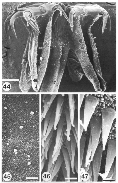 FIGURES 44 -47. Scanning electron micrographs of Calliobothrium evani. 44. Scolex. 45. Microtriches on distal bothridial surface. 46. Microtriches on proximal bothridial surface. 47. Microtriches on scolex peduncle.