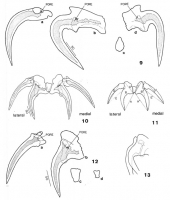 Figures 9-13. 9. Calliobothrium evani sp. n. hook components separated; scale in Figure b applies to a, c,