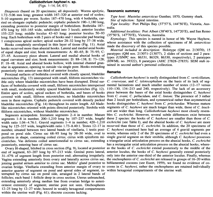 Nasin, C. S., J. N. Caira, and L. Euzet. 1997. Analysis of Calliobothrium (Tetraphyllidea: Onchobothriidae) with descriptions of three new species and erection of a new genus. Journal of Parasitology 83(4): 714-733. (332) Download PDF |