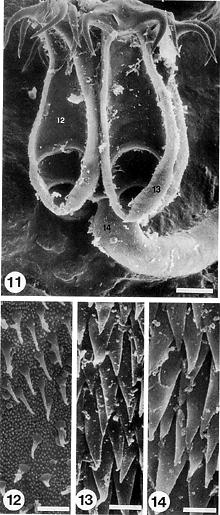 FIGURES 11-14. Calliobothrium hayhowi n. sp. Scanning electron micrographs. 11. Scolex. 12. Microtriches on distal bothridial surface. 13. Microtriches on proximal bothridial surface. 14. Microtriches on scolex peduncle. Scale bars: 11, 50µm. 12-14, 1µm.