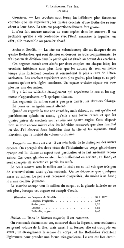 PLATE XIII. FIGURES 1-8. Calliobothrium leuckaertii [sic] n. sp. 1. Strobila de grandeur naturelle. 2. Le meme, vu a la loupe. 3. Quelques segments en voie de developpement, montrant le mode d’apparition des principaux organes; un organe opaque (l’ovaire) se rejette en avant de chaque cote. 4. D’autres segments plus avances, ou le proglottis; ce dernier s’etant separe spontanement, on voit le penis qui est sur le point de se derouler. Les organes opaques sur le cote ont disparu. 5. Tete de scolex isolee. 6. Une bothridie isolee, vue de face. 7. Les crochets, vus de face. 8. Deux crochets, vus de derriere.