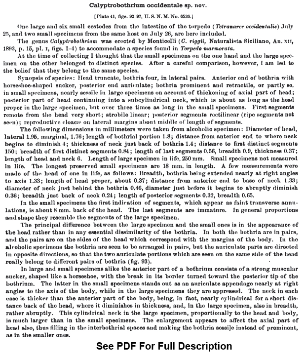 Linton, E. 1907. Notes on Calyptrobothrium, a cestode genus found in the torpedo. Proceedings of the United States National Museum 32: 275-284. (568) Download PDF |
