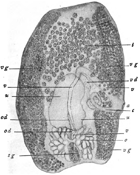 Fig. 2. - Calyptrobothrium occidentale. Free segment; sketch made from specimen, stained and mounted in balsam. Actual length 2.5mm. a, genital cloaca; c, cirrus; o, ovary; o.d., oviduct; s.g., shell gland; t, testes; u, uterus; v, vagina; v.d., vas deferens; v.g., vitelline gland.