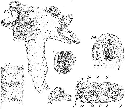 PLATE 41. FIGURES 92-97. Calyptrobothrium occidentale n. sp. 92. Head and neck of small specimen, life. x68. 93. Front view of same, alcoholic. x24. 94. Head of large specimen, alcoholic. x24. 95. Single bothrium (see fig. 92), life. x68. 96. Posterior segments of small specimen, life. x68. 97. Transverse section of one of the posterior segments of large specimen. x80. lv, longitudinal vessle.