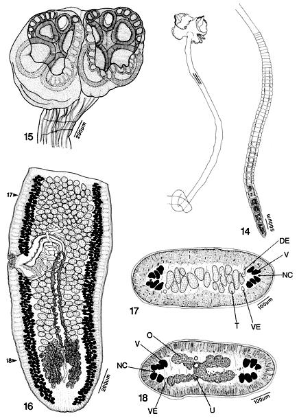 FIGURES 14-18. Cardiobothrium beveridgei n. sp. 14. Entire worm. 15. Scolex. 16. Mature segment. 17 Cross section through mature segment at position indicated by arrow numbered 17 in Figure 16. 18. Cross section through mature segment at position indicated by arrow numbered 18 in Figure 16.