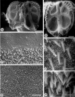 FIGURES 19-24. Cardiobothrium beveridgei n. sp. Scanning electron micrographs of Cardiobothrium beveridgei n. g., n. sp. 19. Scolex. Location at which Figures 21 and 23 were taken are indicated with corresponding numbers. 20. Enlarged view of single bothridium. Location at which Figures 22 and 24 were taken are indicated with corresponding numbers. 21. Microtriches on proximal surface of posterior region of bothridium adjacent to bothridial margin. 22. Microtriches on marginal loculi of distal bothridial surface. 23. Microtriches on margin of proximal bothridial surface. 24. Microtriches at center of distal bothridial surface. Scale bar in Figure 19, 200m; Figure 20, 100m; Figure 21, 2m; Figure 22 and 24, 1m; Figure 23, 500m.