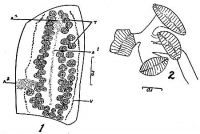 FIGURES 1 & 2. Echeneibothrium multorchidum n. sp. 1. Echeneibothrium multorchidum. Immature proglottid. 2. E. multorchidum. Scolex. A1 - anlage of vas deferens and vagina; A2 - anlage of cirrus sac and vagina; A4 - anlage of ovary; T - testes; V - vitellaria. [Note, segment is upside down in original description]