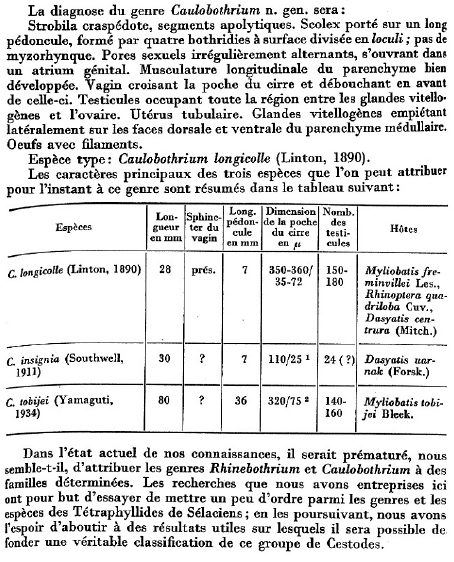 Yamaguti, S. 1934. Studies on the helminth fauna of Japan. Part 4. Cestodes of fishes. Japanese Journal of Zoology 6: 1-112. (510) Download PDFBaer, J. G. 1948. Contributions a l’étude des cestodes des sélaciens. I-IV. Bulletin de la Société Neuchâteloise des Sciences Naturelles 71: 63-122. (49) Download PDF |