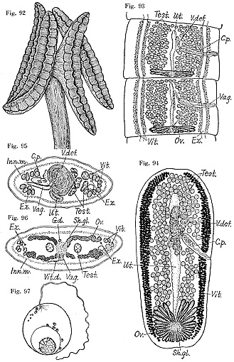FIGURES 92-97. Echeneibothrium tobijei n. sp. 92. Scolex. 93. Anterior segments; dorsal view. 94. Isolated gravid segment; dorsal view. 2.6 x 1.18 mm. 95, 96. Transverse sections of maturing segment. 97. Filamented egg. 42-48 x 36-42 µ. Abbreviations: C.p., cirrus pouch; Ex., excretory system; G.d., germiduct; Inn.m., inner longitudinal muscle; Ov., ovary; Sh.gl., shell gland; Test., testis; [Ut., uterus;] Vag., vagina; V.def., vas deferens; Vit., vitellaria; Vit.d., vitelline duct.