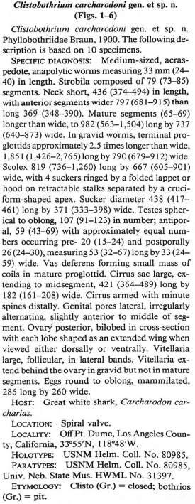 Daily, M. D. and W. Vogelbein. 1990. Clistobothrium carcharodoni gen. et sp. n. (Cestoda, Tetraphyllidea) from the spiral valve of the great white shark (Carcharodon carcharias). Journal of the Helminthological Society of Washington 57: 108-112.