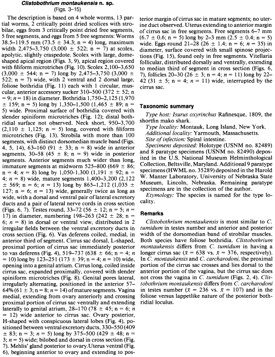 | Total Number of Type Specimens | 4 whole worms, 13 partial worms, 2 critically point dried scoleces with strobilae, eggs from 3 critically point dried free segments, 5 free segments, and eggs from 5 free segments |
