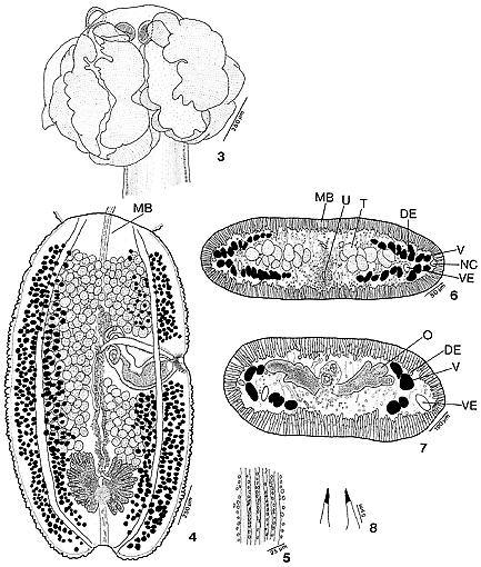 FIGURES 3-8. Clistobothrium montaukensis n. sp. 3. Scolex of holotype (USNM no. 82490) of C. montaukensis. 4. Mature segment, ventral view of paratype (USNM. no. 82490) of C. montaukensis. 5. Dorsomedian muscle band of paratype (USNM no. 82490) of C. montaukensis. 6. Cross section through segment posterior to cirrus sac and anterior to ovary of paratype (HWML no. 35289) of C. montaukensis. 7. Cross section through segment at ovary of paratype (HWML no. 35289) of C. montaukensis. 8. Cirrus microtriche from cross section through cirrus of voucher (HWML no. 35289) of C. montaukensis. DE, dorsal excretory duct; MB, dorsomedian longitudinal muscle band; NC, nerve cord; O, ovary; T, testes; V, vagina; VE, ventral excretory duct.