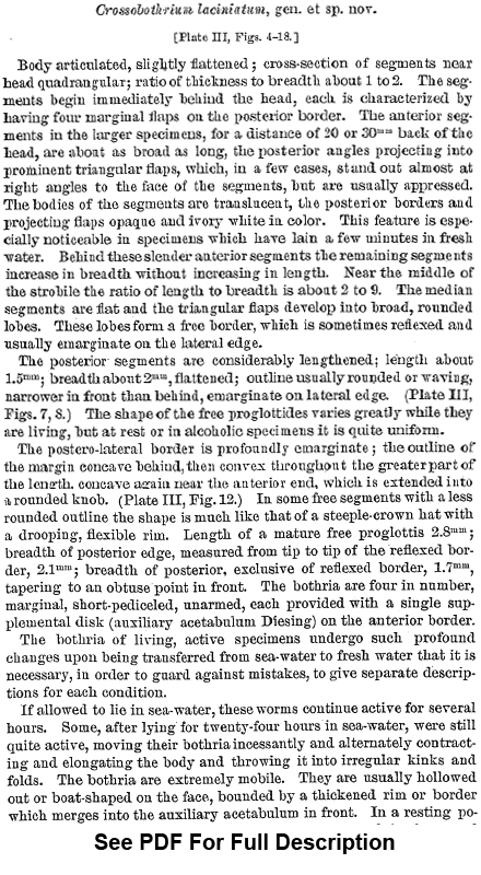 | Scientific Name Notes | Linton (1890, Cit# 1011) recognizes an unusual worm as Crossobothrium laciniatum "Variety longicollis" |