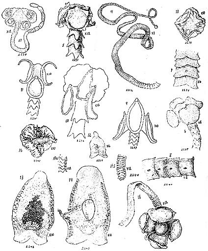 PLATE III. FIGURES 4-18. Crossobothrium laciniatum n. sp. 4. Crossobothrium laciniatum gen. sp. nov., adult strobile, in fresh water, natural size. 5. Head and first segments of same specimen, enlarged 12 diameters. 6. Head and first segments of a specimen after lying for a few minutes in fresh water, enlarged 8 diameters. 7. Posterior segments of same, enlarged 6 diameters. 8. Posterior segments of another specimen, showing lateral openings for the discharge of ova, enlarged 6 diameters. 9. Head and first segments of adult, showing one position of bothria while in motion. The bothrium in front view and the one opposite (not shown in scetch) are thrust foreward, enlarged 10 diameters. 10. The same, with one bothrium flattened out and applied ot the bottom of the watch-glass, enlarged 10 diameters. 11. The same with two bothria pushed forward, the ends extended and curled outward, enlarged 10 diameters. 12. Free proglottis showing lateral opening for discharge of ova, enlarged 6 diameters. 13. Free proglottis before the ova are discharged, flattened under the compressor, enlarged 10 diameters. 14. Another after most of the ova have been discharged from the lateral opening, also flattened under compressor, enlarged 10 diameters. 15. Front view of head of specimen transferred from fresh water to alcohol, enlarged 10 diameters. 16. Transverse section through another specimen, enlarged 10 diameters. 17. Young strobile before segments have made their appearance near the head. The joints at the posterior and are pseudosegmens; flattened under compressor, enlarged12 diameters. 18. Head and anterior part of a young specimen in fresh water, enlarged 12 diameters. 18a. Anterior segments of same, enlarged 12 diameters. 18b. Posterior segments of same, emlarged 12 diameters.