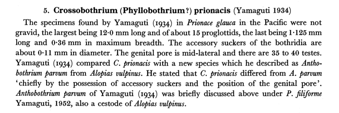 Synonyms Phyllobothrium prionacis Yamaguti, 1934; Paraorygmatobothrium prionacis (Yamaguti, 1934) Ruhnke, 1996