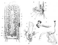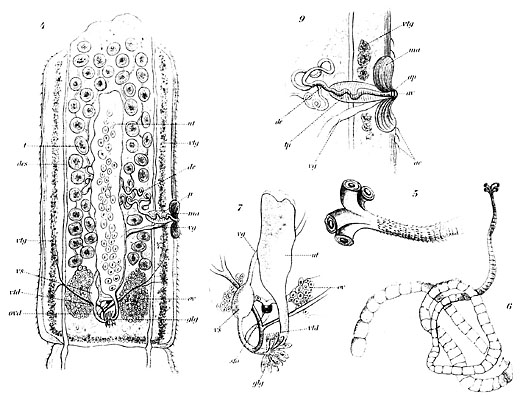 FIGURES 4-7, 9. Cyatocotyle marchesettii n. sp. 4. Sezione frontale di proglottide, molto obliqua, alquanto schematizzata. Vi si notano: il pene, il deferente, i testicoli, la vagina, l’utero, l’ov... MoreFIGURES 4-7, 9. Cyatocotyle marchesettii n. sp. 4. Sezione frontale di proglottide, molto obliqua, alquanto schematizzata. Vi si notano: il pene, il deferente, i testicoli, la vagina, l’utero, l’ovario, l’ootipo, i vitellodotti pari, i vasi escretori longitudinali X 80. 5. Scolice visto da una faccia X 5. 6. Aspetto generale dell’animale, da un esemplare conservato in alcool. Grandezza naturale. 7. Figura schematica, per dimostrare i rapporti reciproci degle organi genitali femminili. 9. Sezione frontale di proglottide che mette in evidenza lo sbocco della vagina e del pene, i rapporti reciproci di entrambi coll’atrio genitale X 40. Abbreviations: ac, aculei; ap, aperura del pene; av, apertura della vagina; de, deferente; des, dotto escretore longitudinale; glg, glandole del guscio; ma, muscoli dell’atrio; ov, ovario; ovd, ovidotto; p, pene; sfo, sfintere ovarico; t, testicoli; tp, tasca del pene; ut, utero; vg, vagina; vs, ricettacolo seminale interno; [vtd, vitelline duct?]; vtg, vitellogeni; vts, ventose. |