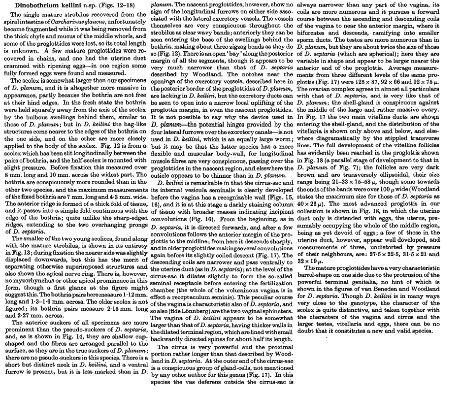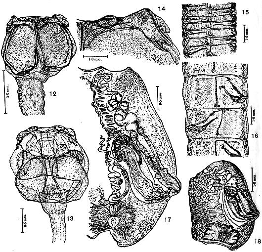 FIGURES 12-18. Dinobothrium keilini n. sp. 12. Scolex from mature strobilus (mounted half-scolex, seen from the outer face; owing to pressure the `bulbous vesicles’ behind the bothria are seen projecting on either side of them). 13. Scolex of very young strobilus (whole-mounted, nearer half slightly displaced downwards). 14. Bothridial crest (portion of half-scolex, mounted with pressure) showing true sucker and reflexed bifid lobe, here folded, at the outer end of crest. Direction of muscle fibres, as in other figures, shown by stippled lines. 15. Nascent proglottides (cf. Fig. 5). Note developing genital ducts and wide ventral cleft, here of different shape on the poral and aporal sides of the proglottis. The ventral excretory vessle in this species is throughout the strobilus much wider and more conspicuous than the dorsal; the inter- segmental openings of these vessles are never so obvious as in D. planum, and are not accompanied by furrows or notches in the body wall. 16. Young proglottides (cf. similar stage cin D. planum Fig. 6) The numerous testes are at an early stage but no vitellaria can be seen. Note the comparatively early development of the median region of the vagina in this and previous Fig., and yet the development of its distal portion lags far behind that of the cirrus-sac, which is more advanced than in Fig. 6. The fascia of longitudinal muscle fibers obliterated the ventral cleft from this dorsal view. 17. Dorsal view of portion of maturing proglottis at the beginning of the female phase: the vagina is distended with sperm and eggs are beginning to fill the uterine duct. Note the two sphincters on the vagina and the fine spines on its distal portion. 18. Dorsal view of mature, but not gravid, proglottis showing maximum developement of vitellaria, and ovary with medial shell-gland surrounding the oötype and fertilization chamber above; followed by the now very distended uterine duct, packed with developing eggs; the underlying uterus, destined to fill the median field, is as yet empty.