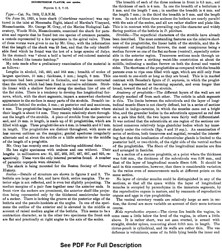 PLATE 1. FIGURES 2 & 3. Dinobothrium planum n. sp. 2. Dinobothrium planum, from Cetorhinus maximus. Front view of scolex. Length of bothrium 7mm. 3. Marginal view of scolex. Length of bothrium 7mm... MorePLATE 1. FIGURES 2 & 3. Dinobothrium planum n. sp. 2. Dinobothrium planum, from Cetorhinus maximus. Front view of scolex. Length of bothrium 7mm. 3. Marginal view of scolex. Length of bothrium 7mm.