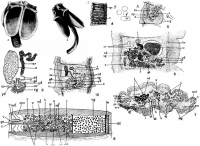 PLATE 4. FIGURES 11-13. Dinobothrium planum n. sp. 11. Dinobothrium planum. Median sagittal section of immature proglottis, partly diagrammatic, more than one section having been used in representing the anatomy in the region of the shell gland. Length of proglottis, 0.4mm. For explanation of lettering see p. 9. 12. Dinobothrium planum. Diagram of part of female reproductive organs. For explanation of lettering see p. 9. 13. Stereogram of mature proglottis, view from ventral side. For explanation of lettering see p. 9. [Abbreviatitons:] c, cuticle; cp, cirrus pouch; ev, excretory vessel; evd, dorsal excretory vessel; evv, ventral excretory vessel; ga, genital aperture; gc, ganglion cells; gd, germ duct; lm, longitudinal muscles; n, nerve; o, ovary (germarium); ov, oviduct; sc, subcuticula; scg, subcuticular glands; sd, sperm duct; sg, shell-gland; sr, seminal receptacle; t, testes; u, uterusa; v, vagina; vd, vas deferens; vg, vitellaria; yd, yolk duct. |