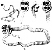 FIGURES 4-8. Diplobothrium simile n. sp. 4. Diplobothrium simile, à l’état de strobile. 5. Scolex vu d’en haut pour montrer la séparation incomplète des bothridies. Au milieu on voit aussi quatre pièces qui semblent servir de points d’attache aux paris musculares. 6. Le même vu du côte opposé: on dirait les quatre bothridies complètement séparées. 7. Encore la même tête de scolex, vue comme dans la figure 5, avec des parois différemment constituées. 8. Le scolex d’un autre individu.