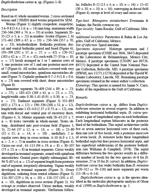 Ruhnke, T. R., S. S. Curran and T. Holbert. 2000. Two new species of Duplicibothrium Williams & Campbell, 1978 (Tetraphyllidea: Serendipidae) from the Pacific cownose ray Rhinoptera steindachneri. Systematic Parasitology 47: 135-143. (3855) Download PDF |