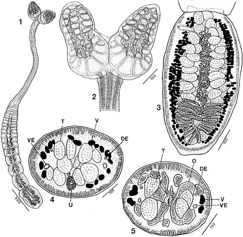 FIGURES 1-5. Duplicibothrium cairae n. sp. 1. Entire worm of holotype (CNHE no. 3846). 2. Scolex of paratype (CNHE no. 3847). 3. End segment of paratype, ventral view (USNPC no. 89726). 4. Cross-section through segment anterior to ovary of paratype (USNPC no. 89726). 5. Cross-section through segment at level of ovary of paratype (USNPC no. 89726). Abbreviations: DE, dorsal excretory duct; O, ovary; T, testis; U, uterus; V, vitellarium; VE, ventral excretory duct.