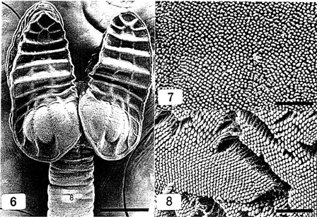 FIGURES 6-8. Duplicibothrium cairae n. sp. 6. Scolex (numbers indicate regions of scolex illustrated in Figures 7, 8). 7. Enlarged view of distal bothridial surface. 8. Enlarged view of cephalic peduncle. Scale bars: 6, 200 µm; 7,8, 1 µm.