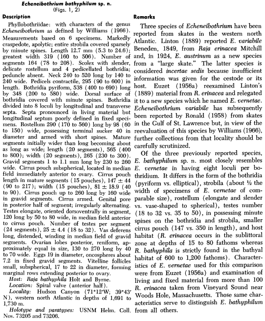Campbell, R. A.. 1975. Two new species of Echeneibothrium (Cestoda: Tetraphyllidea) from skates in the western North Atlantic. Journal of Parasitology 61: 95-99. (107) Download PDF |