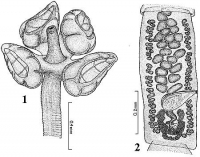 FIGURES 1 & 2. Echeneibothrium bathyphilum n. sp. 1. Scolex, E. bathyphilum. 2. Mature segment, E. bathyphylum.