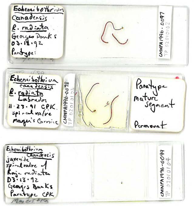 Keeling, C. P. and M. D. B. Burt. 1996. Echeneibothrium canadensis n. sp. (Tetraphyllidea: Phyllobothriidae) in the spiral intestine of the thorny skate (Raja radiata) from the Canadian Atlantic Ocean. Canadian Journal of Zoology 74: 1590-1593. (257) Download PDF |