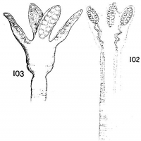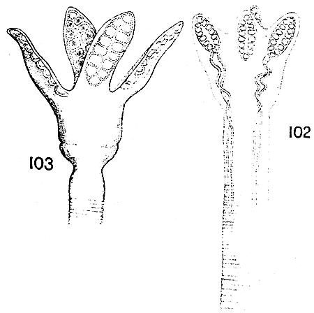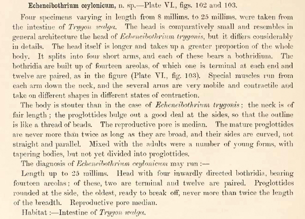 PLATE VI. FIGURES 102 & 103. Echeneibothrium ceylonicum n. sp. 102. Anterior end of Echeneibothrium ceylonicum, magnified. 103. Head of the same, more highly magnified.