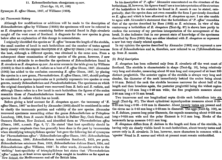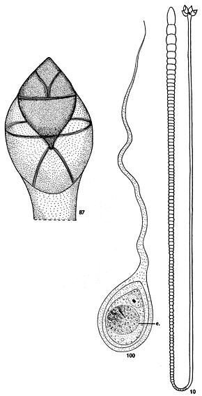 FIGURES 10, 87, 100. Echeneibothrium elongatum n. sp. 10. Echeneibothrium elongatum sp. nov. from R. circularis. 87. Bothridium of Echeneibothrium elongatum sp. nov. from R. circularis. 100. Egg of E. elongatum sp. nov. from R. circularis.