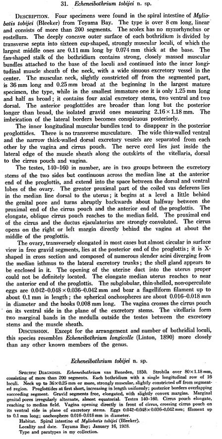 Yamaguti, S. 1934. Studies on the helminth fauna of Japan. Part 4. Cestodes of fishes. Japanese Journal of Zoology 6: 1-112. (510) Download PDF |