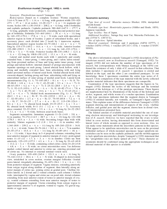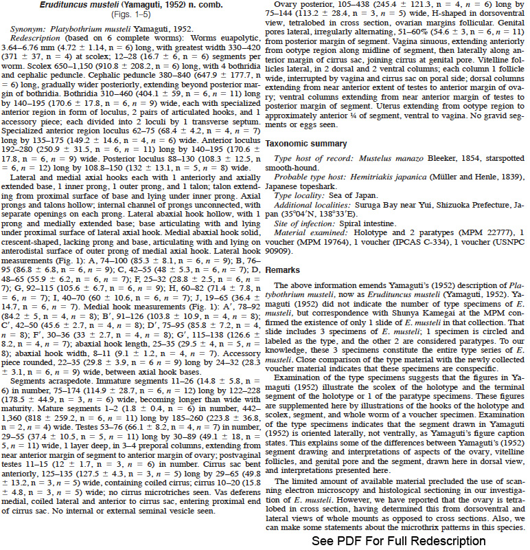 Yamaguti, S. 1952. Studies on the helminth fauna of Japan. Part 49. Cestodes of fishes, II. Acta Medicinae Okayama 8: 1-76. (511) Download PDFHealy, C. J., T. Scholz and J. N. Caira. 2001. Erudituncus n. gen. (Tetraphyllidea: Onchobothriidae) with a redescription of E. musteli (Yamaguti, 1952) n. comb. and comments on its hook homologies. Journal of Parasitology 87(4): 833-837. (3862) Download PDF |