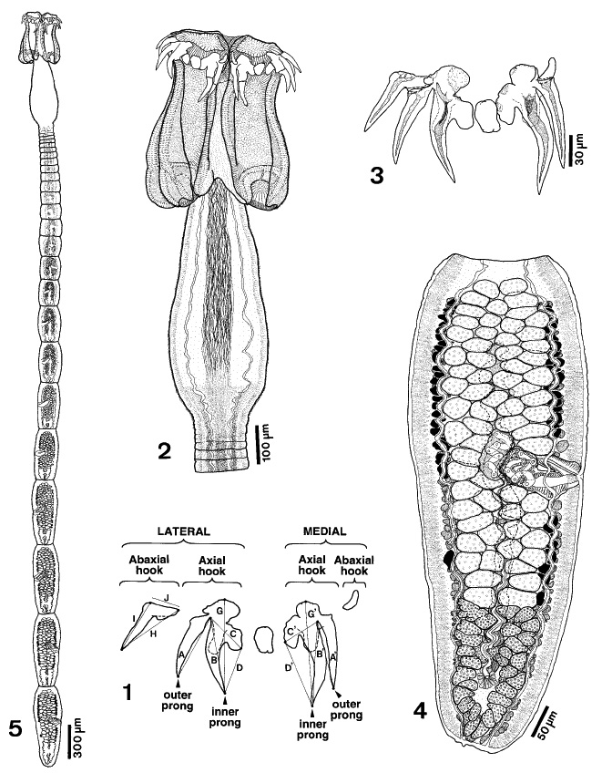 FIGURES 1-5. Line drawings of Erudituncus musteli n. comb. 1. Hook components drawn disarticulated to more clearly illustrte hook terminology and hook measurements. 2. Scolex of voucher (MPM 19764). 3. Hooks of holotype (MPM 22777). 4. Dorsal view of segment of voucher (MPM 19764). 5. Whole worm drawing of voucher (MPM 19764).