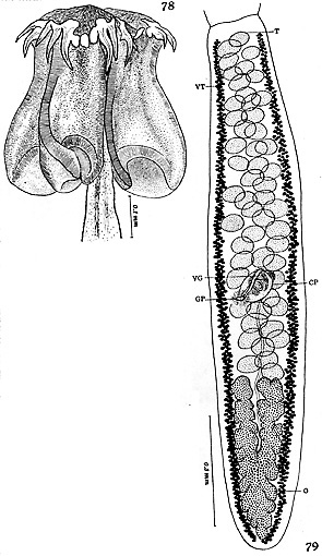 PLATE XIV. FIGURES 78 & 79. Platybothrium musteli n. sp. 78. Scolex, ventral view. 79. End proglottis, ventral view. Abbreviations: CP, cirrus pouch; GP, genital pore; O, ovary; T, testis; VG, vagina; VT, vitellaria.