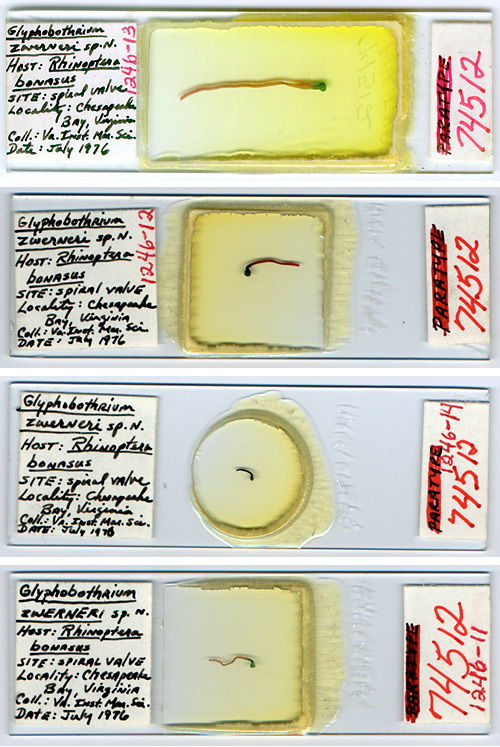 Williams, A. D. and R. A. Campbell. 1977. A new tetraphyllidean cestode, Glyphobothrium zwerneri gen. et sp. n., from the cownose ray, Rhinoptera bonasus (Mitchill 1815). Journal of Parasitology 63(5): 775-779.