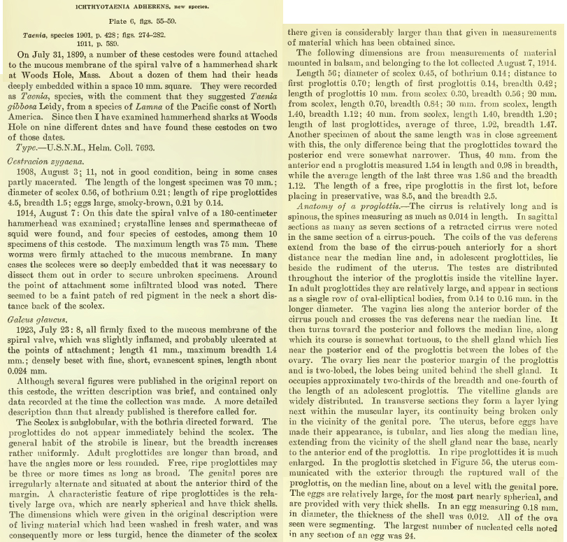 | Type Material | USNPC No. 7693 (type) [possibly also vialed material labeled 5/9 Ichthyotaenia adherens, Sphyrna zygaena, 2088c, Wood’s Hole 8/3.08-2 specimens and a free proglottid- see Riser (1955)] |
