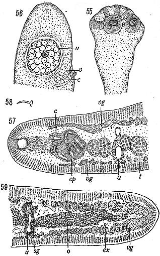 PLATE 6. FIGURES 55-59. Ichthiotaenia [sic]adherens n. sp. 55. Scolex; balsam; diameter 0.45. 56. Anterior end of ripe proglottis with wall ruptured exposing the uterus filled with, large, segmenting ova; breadth, in front of genital pore, 1.68. 57. Part of transverse section of immature proglottis near genital pore; two sections used; diameter of section at median line 0.5. 58. Spine from cirrus; length about 0.008. 59. Part of transverse section near posterior end of immature proglottis; diameter at median line 0.5. Abbreviations: c, cirrus; cp, cirrus pouch; ex, excretory vessel; o, ovary (germarium); sg, shell gland; t, testes; u, uterus; v, vagina; vg, vitelline gland.