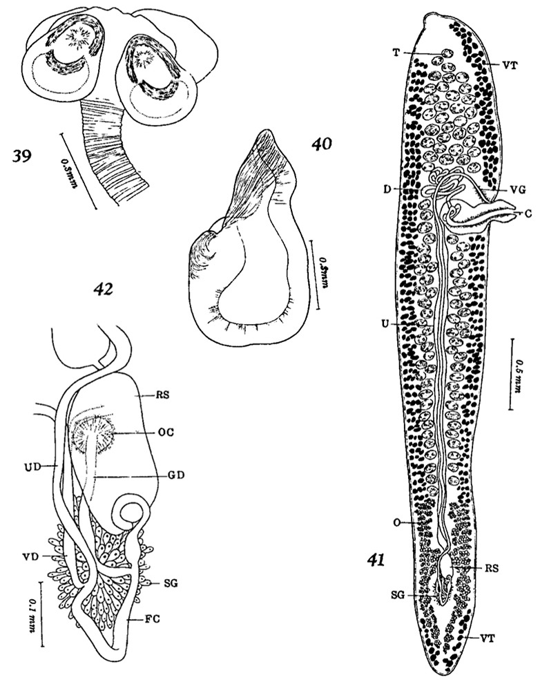 PLATE VIII. FIGURES 39-42. Marsupiobothrium alopias n. sp. 39. Scolex of Marsupiobothrium alopias, ventral view. 40. Bothridium of scolex of Marsupiobothrium alopias, lateral view. 41. Free proglottis of Marsupiobothrium alopias, dorsal view. 42. Complex of gential ducts of Marsupiobothrium alopias, dorsal view.