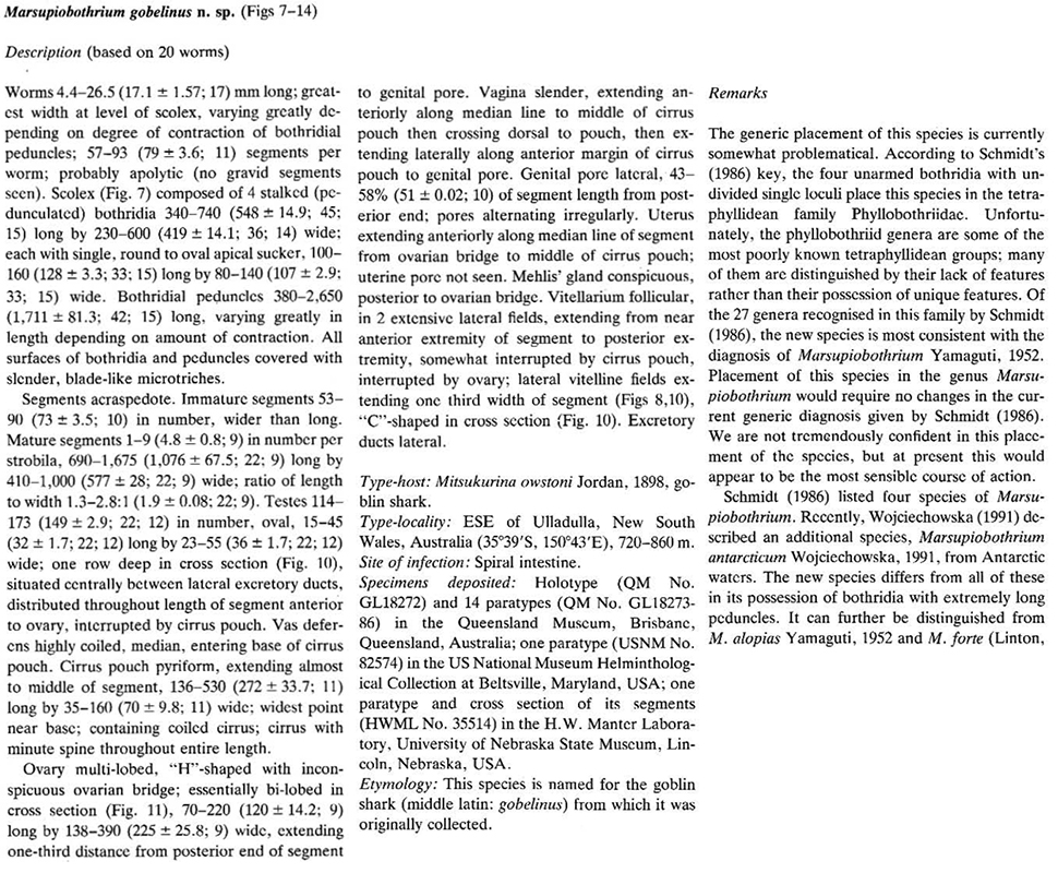 | Scientific Name Notes | M. gobelinus is a valid species but is incertae sedis with respect to Marsupiobothrium. |