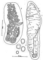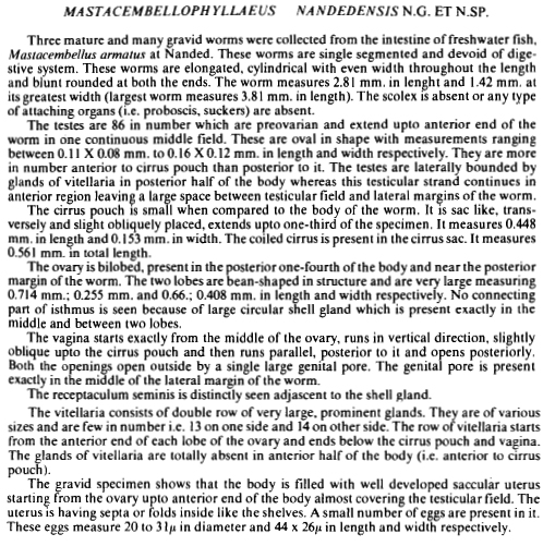 | Scientific Name Notes | Shinde & Chincholikar (1977) described these worms as being “single segmented and devoid of digestive system...The scolex is absent or any type of attaching organs (i.e. proboscis, suckers) are absent.” It is clear that these “worms” are segments of a tapeworm, possibly a proteocephalidean. |