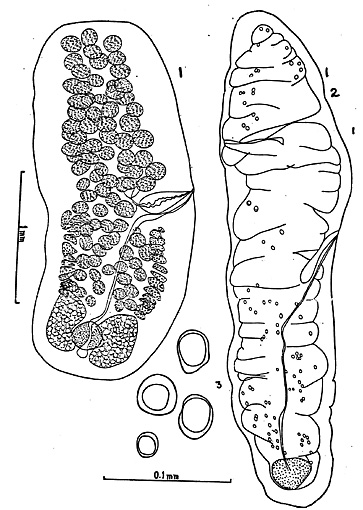 FIGURES 1-3. Mastacembellophyllaeus nandedensis n. sp. 1. Mature worm. 2. Gravid worm. 3. Eggs.