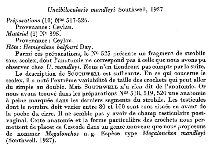 Southwell, T. 1927. On a collection of cestodes from marine fishes of Ceylon and India. Annals of Tropical Medicine and Parasitology 21: 351-373. (444) Download PDFBaer, J. G. and L. Euzet. 1962. Revision critique des cestodes tétraphyllides décrits par T. Southwell (1re partie).. Bulletin de la Société Neuchâteloise des Sciences Naturelles 85: 143-172. (54) Download PDF |