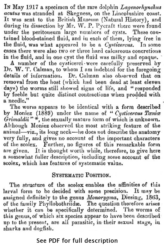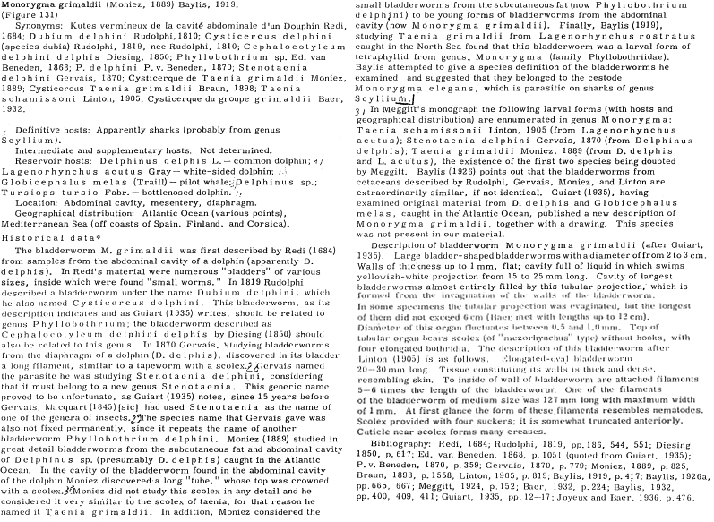 Moniez, M. R. 1889. Sur la larvae Taenia grimaldii nov. sp., parasite du dauphin. Comptes Rendus Hebdomadaires Des Seances de L'Academie des Sciences 109(1): 825-827. (6100) Download PDFBaylis, H. A. 1919. A remarkable Cysticercus from a rare dolphin (Cysticercus taeniae grimaldii, Moniez, 1889). Annals and Magazine of Natural History, Series 9 3: 417-424. (55) Download PDF |