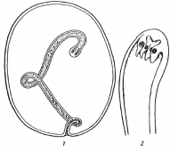 From Delyamure, 1955 (Cit# 4208). Monorygma grimaldii (Moniez, 1889) Baylis, 1919; 1 - general view of larvae; 2 - scolex (after Guiart, 1935).