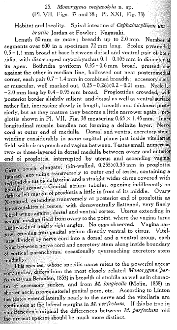 Yamaguti, S. 1952. Studies on the helminth fauna of Japan. Part 49. Cestodes of fishes, II. Acta Medicinae Okayama 8: 1-76. (511) Download PDF |