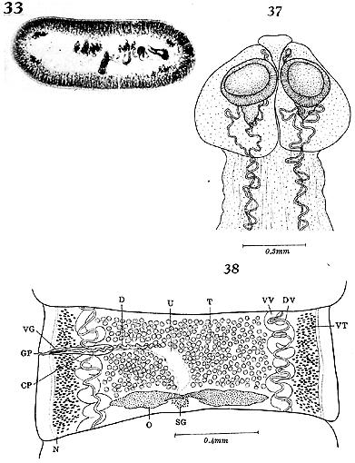 PLATE VII. FIGURES 37 & 38. Monorygma megacotyla n. sp. 37. Scolex of Monorygma megacotyla, ventral view. 38. Mature proglottis of Monorygma megacotyla, dorsal view. CP = cirrus pouch, D = vas deferens, DV = dorsal vessel, GP = genital pore, O = ovary, N= nerve trunk, SG = shell gland, T = testis, U = uterus, VG = vagina, VT = vitallaria, VV = ventral vessel.